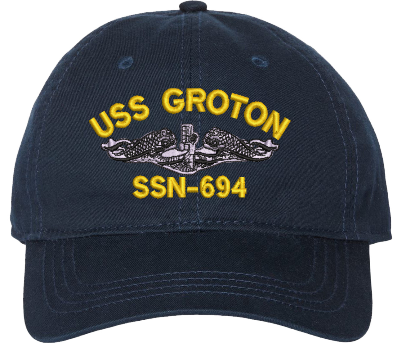 Show your Navy pride with this USS Groton SSN-694 with Dolphins Unstructured Dad Cap from SubmarineGear. Crafted from 100% washed chino twill cotton, this six-panel, low-profile cap offers a relaxed and comfortable fit. Featuring high-quality embroidery done in our Scottsboro, Alabama facility, this cap is designed with a pre-curved visor and an adjustable tri-glide buckle closure for a perfect fit. Whether for everyday wear or as a meaningful gift, this cap is a great way to honor your own or a loved one's service.