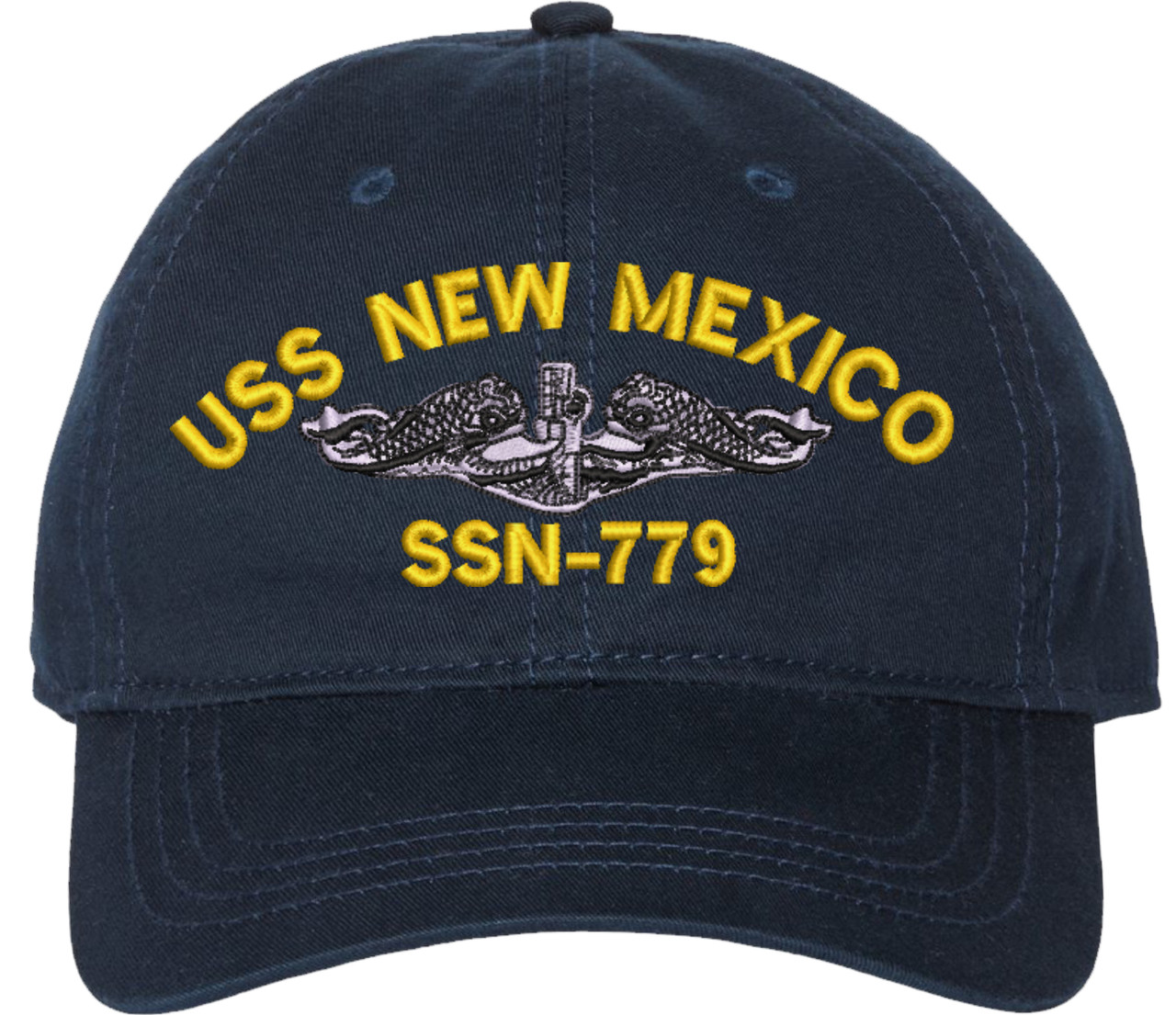 Show your Navy pride with this USS New Mexico SSN-779 with Dolphins Unstructured Dad Cap from SubmarineGear. Crafted from 100% washed chino twill cotton, this six-panel, low-profile cap offers a relaxed and comfortable fit. Featuring high-quality embroidery done in our Scottsboro, Alabama facility, this cap is designed with a pre-curved visor and an adjustable tri-glide buckle closure for a perfect fit. Whether for everyday wear or as a meaningful gift, this cap is a great way to honor your own or a loved one's service.