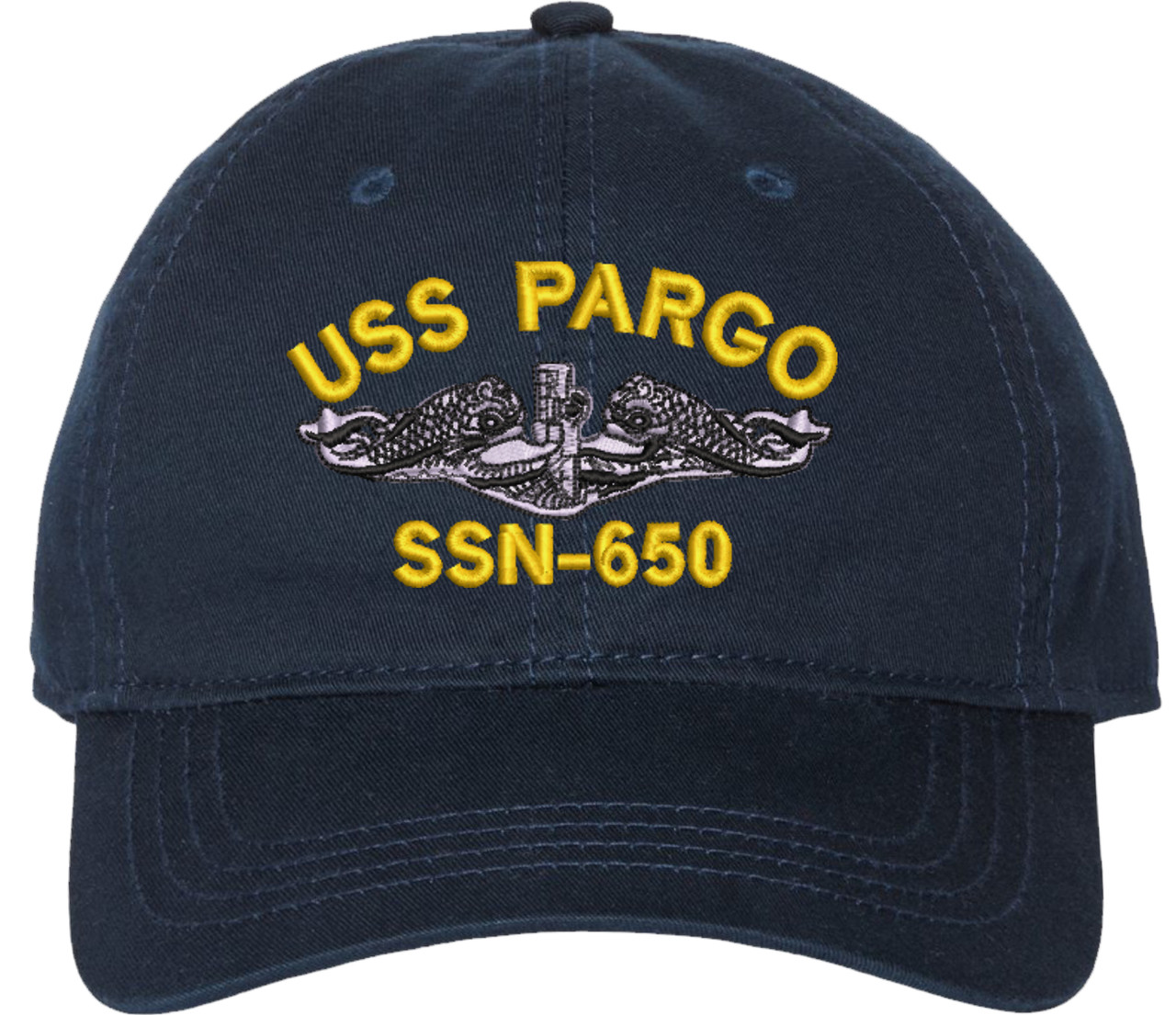 Show your Navy pride with this USS Pargo SSN-650 with Dolphins Unstructured Dad Cap from SubmarineGear. Crafted from 100% washed chino twill cotton, this six-panel, low-profile cap offers a relaxed and comfortable fit. Featuring high-quality embroidery done in our Scottsboro, Alabama facility, this cap is designed with a pre-curved visor and an adjustable tri-glide buckle closure for a perfect fit. Whether for everyday wear or as a meaningful gift, this cap is a great way to honor your own or a loved one's service.