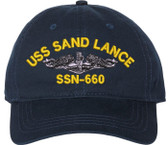Show your Navy pride with this USS Sand Lance SSN-660 with Dolphins Unstructured Dad Cap from SubmarineGear. Crafted from 100% washed chino twill cotton, this six-panel, low-profile cap offers a relaxed and comfortable fit. Featuring high-quality embroidery done in our Scottsboro, Alabama facility, this cap is designed with a pre-curved visor and an adjustable tri-glide buckle closure for a perfect fit. Whether for everyday wear or as a meaningful gift, this cap is a great way to honor your own or a loved one's service.