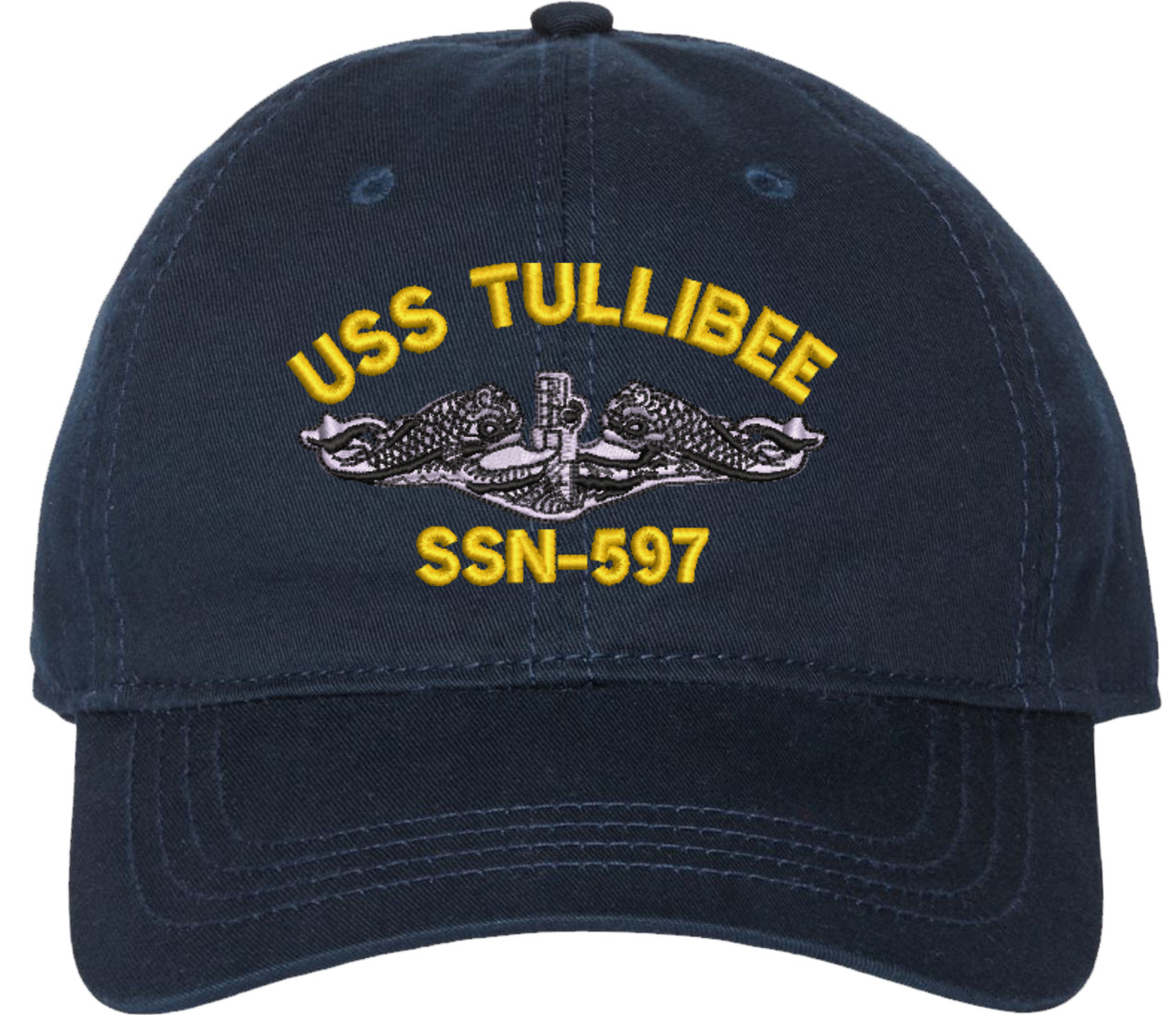Show your Navy pride with this USS Tullibee SSN-597 with Dolphins Unstructured Dad Cap from SubmarineGear. Crafted from 100% washed chino twill cotton, this six-panel, low-profile cap offers a relaxed and comfortable fit. Featuring high-quality embroidery done in our Scottsboro, Alabama facility, this cap is designed with a pre-curved visor and an adjustable tri-glide buckle closure for a perfect fit. Whether for everyday wear or as a meaningful gift, this cap is a great way to honor your own or a loved one's service.